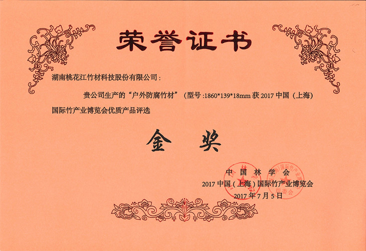 湖南桃花江竹材科技股份有限公司生產(chǎn)的戶外防腐竹地板在2017年7月中國(上海)國際竹產(chǎn)業(yè)博覽會中榮獲金獎,該獎項由中國林學會、中國(上海)國際竹產(chǎn)業(yè)博覽會頒發(fā)。湖南桃花江竹材科技作為中國竹材領(lǐng)域高炭防腐技術(shù)的發(fā)明者,在中國竹材領(lǐng)域有著舉足輕重的地位。湖南桃花江竹材科技一直專注與于竹材的戶外運用研發(fā)與創(chuàng)新,為全球客戶提供優(yōu)質(zhì)竹材。