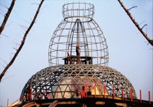可不要認為用竹藤做建筑材料是很簡單的事。在以“零化學(xué)物質(zhì)”著稱的印度館內(nèi)使用了世界上最大的竹制穹頂:一根跨度逾三十四米的頂梁,要用竹材加工出弧度來,其難度可想而知。竹子最終能夠“挑大梁”,實際上是利用現(xiàn)代工藝和科技對傳統(tǒng)材料進行再加工的結(jié)果。